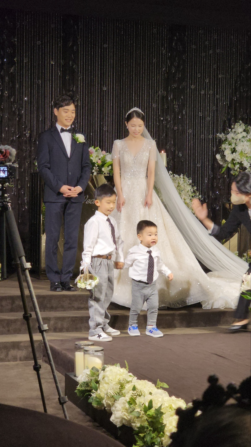우진 우성이, 우우형제가 화동으로 상큼한 음악에 맞춰 꽃바구니를 들고 엉크와 엉크이모에게 걸어가던 모습에 하객들도 즐거워했다. 그토록 많은 사람들이 지켜보고 있는데 귀엽고도 당당하게 엉크(삼촌)에게 다가서면서 몹시 신기해하던 3살 우성이는 두리번두리번, 그래도 네 살이나 많다고 어리둥절하는 동생을 점잖게 챙기던 우진이.. 이 귀여운 화동들 덕분에 결혼식은 최고조의 분위기로 향했다.
